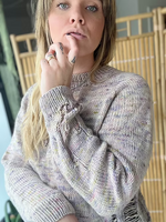 Sweateren strikkes oppefra og ned og rundt for det meste. Halskanten strikkes frem og tilbage, samles foran midt på forstykket og strikkes derefter rundt. Ærmerne skilar ad fra resten af líkamanum. Masker samles op ved opslagskanten for at strikke kraven. De tabte masker strikkes eftir diagrammer. Sjá hvernig þú fylgir skýringarmynd með henni: