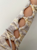 Sweateren er strikket oppefra og ned, frem og tilbage fyrir það mest af verkefninu. Den starter med bærestykket med udtagninger og med en åben halskant, der strikkes frem og tilbage og først sættes sammen efter at halskanten er strikket færdig og strikkes herefter rundt. Når bærestykket er færdigt tages ærmemaskerne fra og líkamans og ærmerne fortsætter hver for sig på rundpinde/strømpepinde. Både krop og ærmer åbnes op i så der kan fortsættes på nøghullet der fortsætter gennem sweateren, hvor sweateren så igen strikkes frem og tilbage med indtagninger og udtagninger for at lave hullerne. Kanten strikkes med i-cord tækni, það er sama gildir fyrir de 3 stroppe der skal bruges som bindebånd og sem skal trådes igennem hullerne på bæði krop og ærmer. Kanterne sys fra vrangsiden, tjek gerne billederne der guider dig igennem hvernig man folder og syr keyhullerne og kanten forneden.