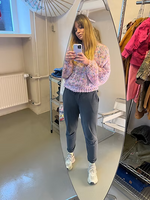 Change the threads accordingly : Every 3rd - 5th row ; remove 1 color and add in another color instead. Just make sure you are always working with 4 strands of mohair/Angel lace at the same time. When you run out of mohair, you can simply felt the threads together. Leave around 10 cm of your end to rub against the new thread, slowly your yarns will start sticking to one another and you will have little or even no threads to weave in when you’re finished with the sweater. Just tie knots with the Angel lace. Push yourself in mixing colors with high contrast or even colors your would normally not put together. See how the colors rub off to one another and how the shades can change. You are your own designer here, as you are not only knitting you are also sculpting your own textile and hopefully emptying out your knitting stash.